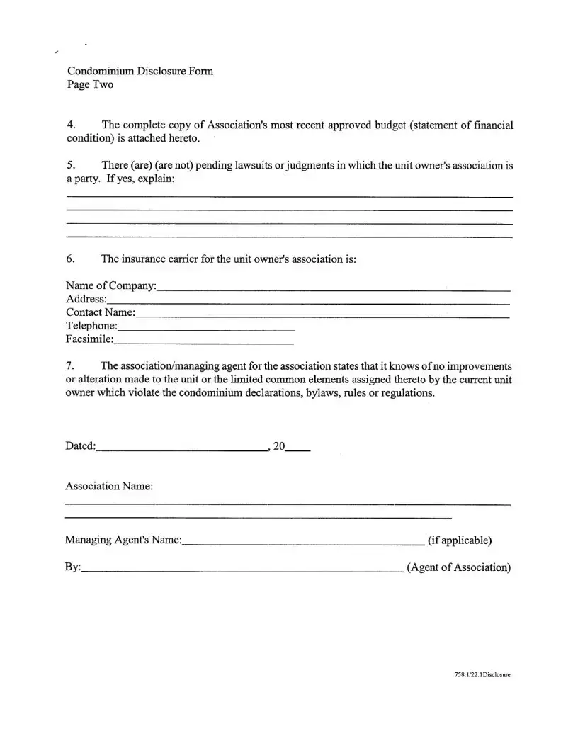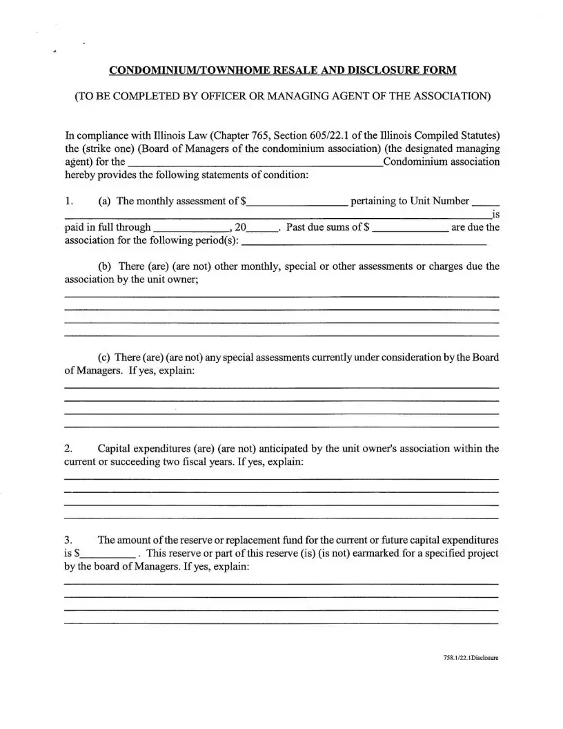 The Act 221 Disclosure form plays a crucial role in the real estate process for condominium and townhome transactions in Illinois. This form, mandated by state law, ensures transparency between the seller and potential buyers regarding the financial health and operational status of the condominium association. It requires the officer or managing agent of the association to provide detailed information about various aspects of the property, including the current status of monthly assessments, any past due amounts, and the presence of special assessments. Additionally, it addresses anticipated capital expenditures and the status of the reserve fund, which is essential for maintaining the property. Buyers will find information about pending lawsuits, the association's insurance coverage, and any alterations made to the unit that may violate existing regulations. By gathering this information, the Act 221 Disclosure form empowers buyers to make informed decisions, fostering trust and clarity in the transaction process.