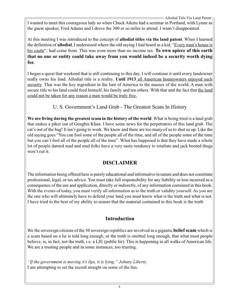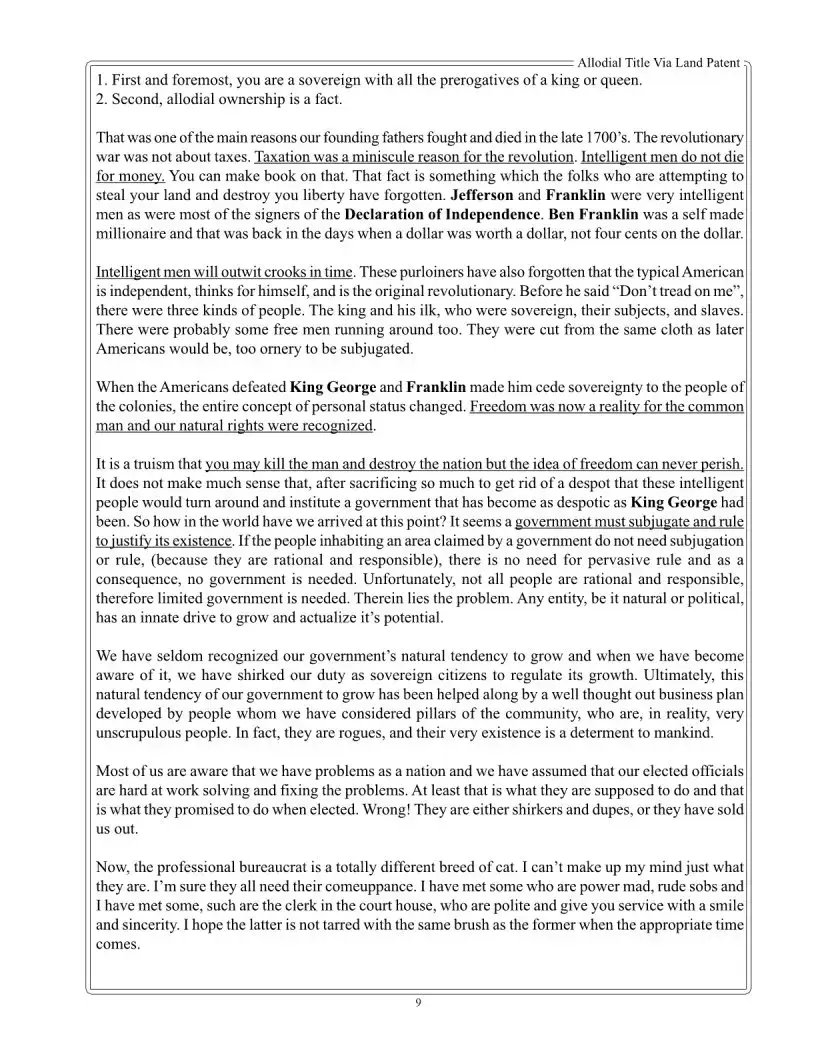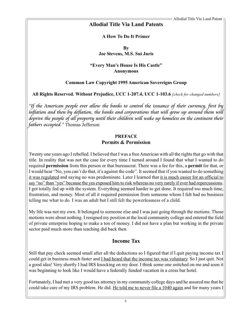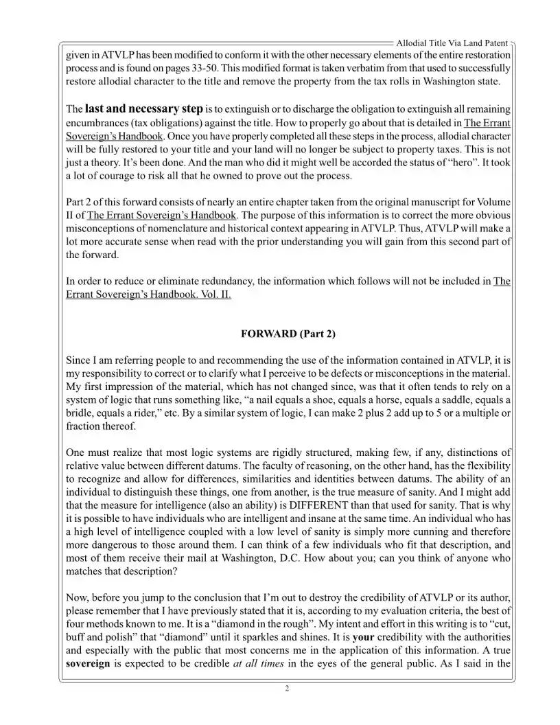 The first step in obtaining an allodial title is to restore your status as a sovereign Elector. This status grants you the authority needed to pursue the remaining actions required for allodial title restoration. Detailed instructions on how to restore your sovereign status can be found in The Errant Sovereign’s Handbook by Augustus Blackstone. Once you have established your sovereign status, you can proceed with the subsequent steps outlined in the Allodial Title Via Land Patent material.