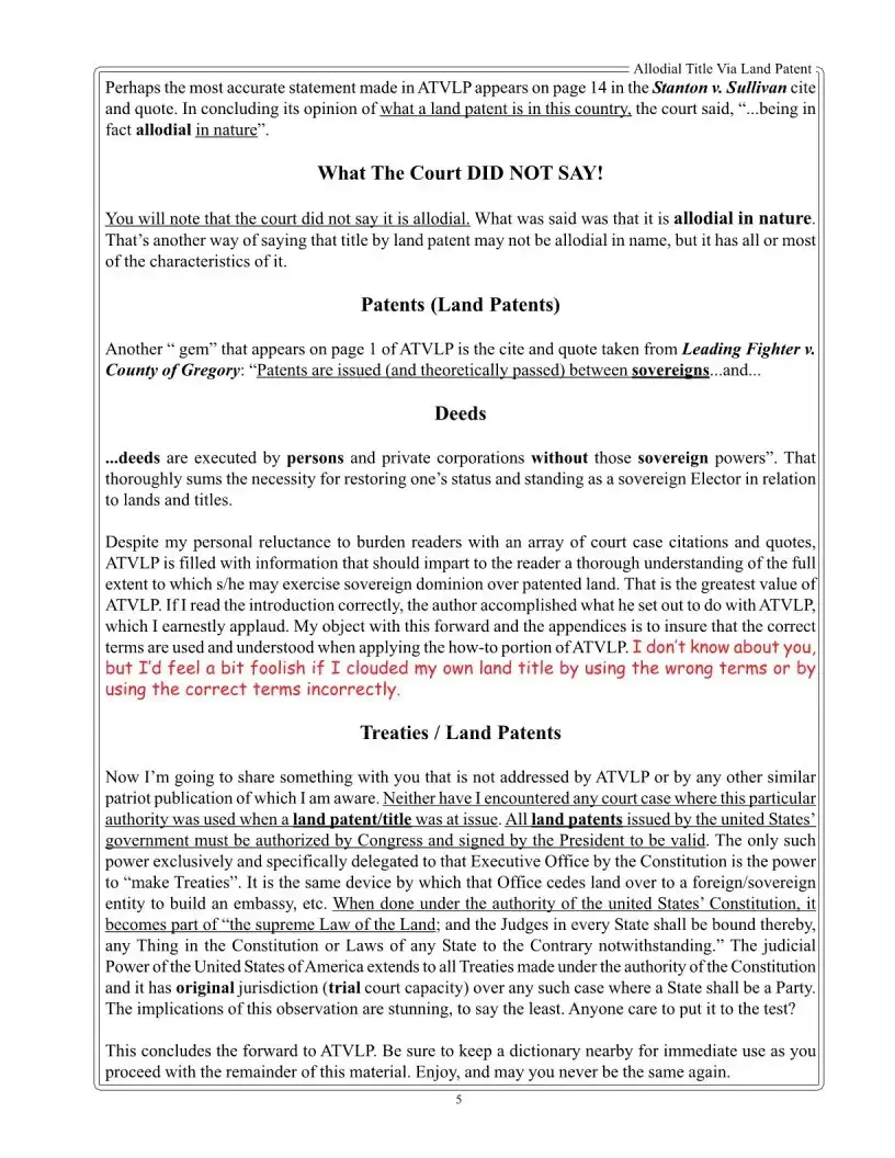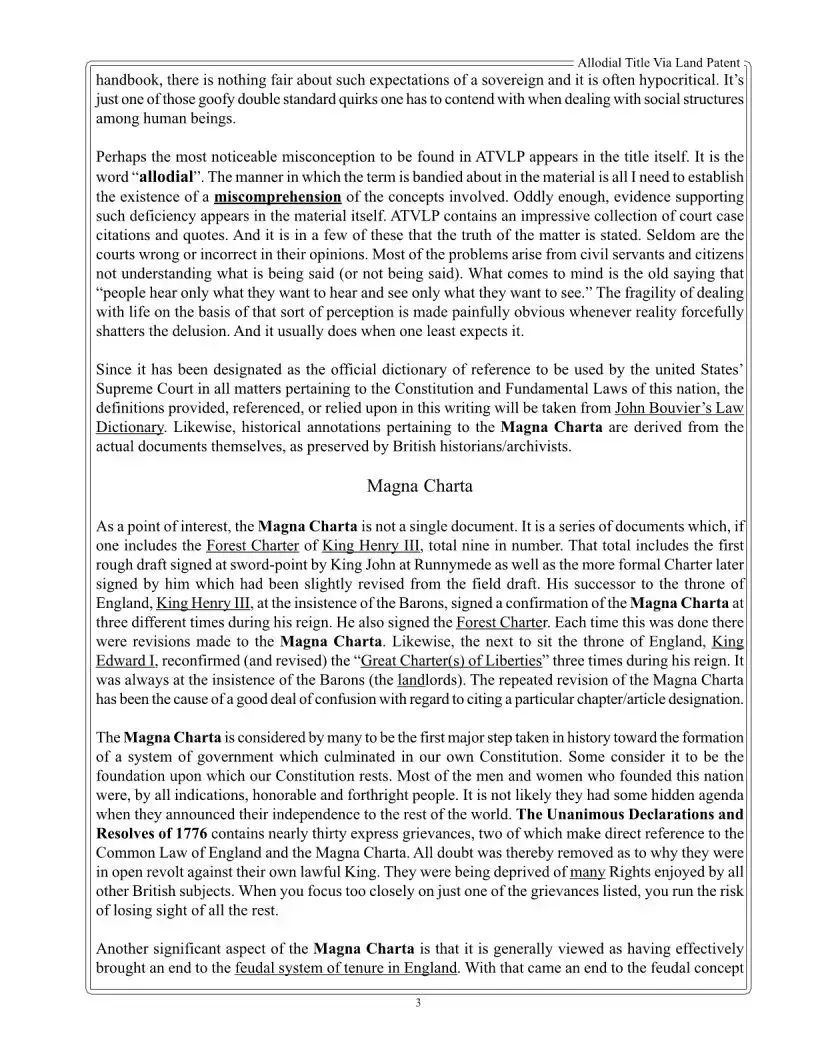 An allodial title refers to a type of land ownership that is free from any superior landlord or sovereign. This means that the owner has complete control over the property without the obligation to pay property taxes or any other encumbrances. The concept of allodial title has historical roots and is often associated with the idea of sovereignty over one’s land. It is important to note that achieving an allodial title typically requires a specific legal process, as outlined in the Allodial Title Via Land Patent material.