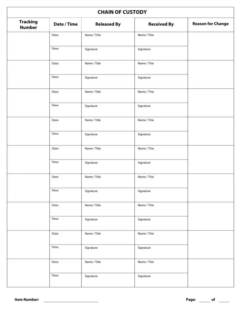 The Chain of Custody form is a crucial document used to track the handling of evidence or property in legal cases. It ensures that the evidence is properly documented, maintained, and preserved from the moment it is collected until it is presented in court. This form provides a clear record of who has handled the evidence, when it was transferred, and the reasons for each transfer.