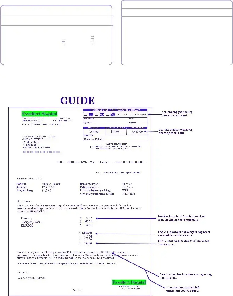 If you receive a hospital bill, review it carefully. Check the details, including your name, address, and the services listed. If everything appears correct, you can make your payment by mail or online. If you have questions, contact Patient Financial Services at 800-803-8155.